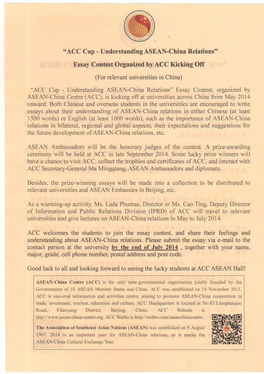 征文题材与体裁无限制,可以是员工在东盟某个国家或几个国家的游记、体会,或对中国-东盟关系的认识及建议,或其他与东盟有关的各类文章。ACC将对获奖员工文章进行中英文对译,制作中英文论文集,并将该书赠与项目院校及员工、东盟各国来访人员、东盟10国驻华大使及官员。