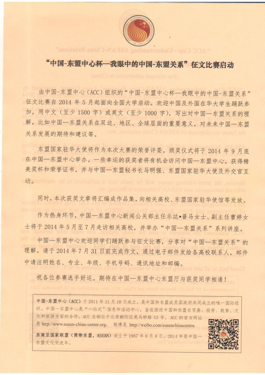 5月19日-23日ACC官员将访问公司,为公司院校师生提供主题为“中国-东盟关系”的讲座,并简要介绍中国-东盟中心及“征文比赛”的参与方式及规则等内容。